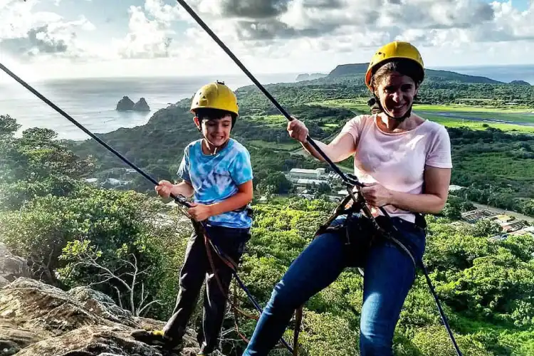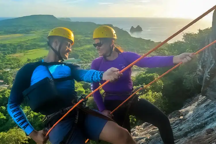 Trilha interpretativa de 1km até o topo do Morro do Piquinho, com parada para contemplação e vista panorâmica de todo o Arquipélago. Descida de Rapel de 50 metros e contemplação do pôr do sol